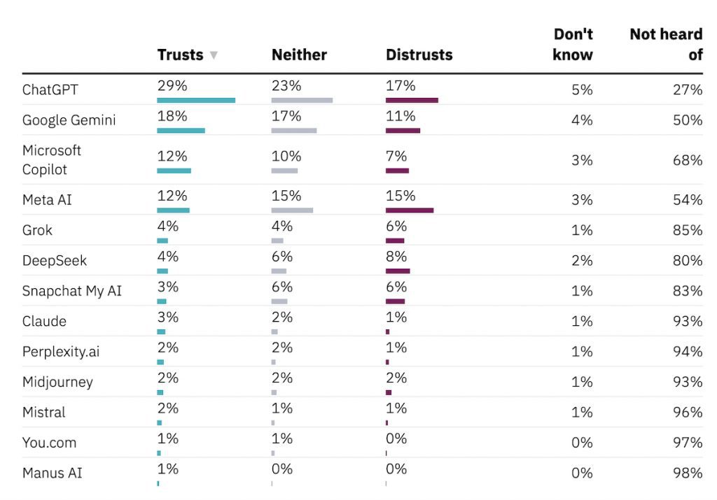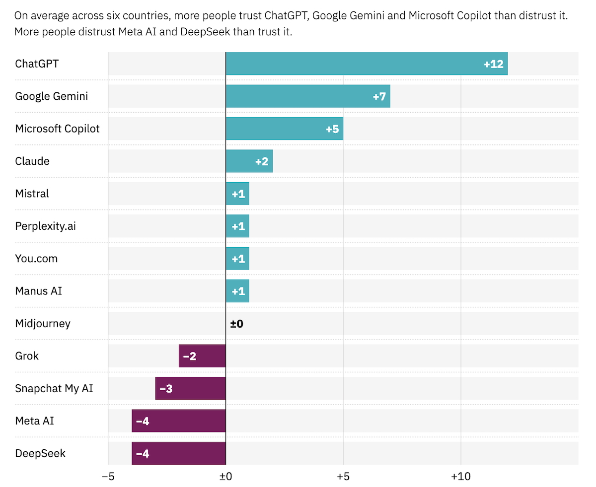 Cette tendance confirme une observation déjà formulée l’an dernier par le Reuters Institute. La confiance suit la courbe d’adoption. Les utilisateurs et utilisatrices ont tendance à se fier davantage aux produits qu’ils utilisent régulièrement ou qui appartiennent à des entreprises qu’ils identifient et perçoivent comme stables. Cela explique pourquoi ChatGPT et Gemini conservent une nette avance sur leurs concurrents, tandis que Meta AI, DeepSeek ou Grok peinent encore à inspirer la même assurance.