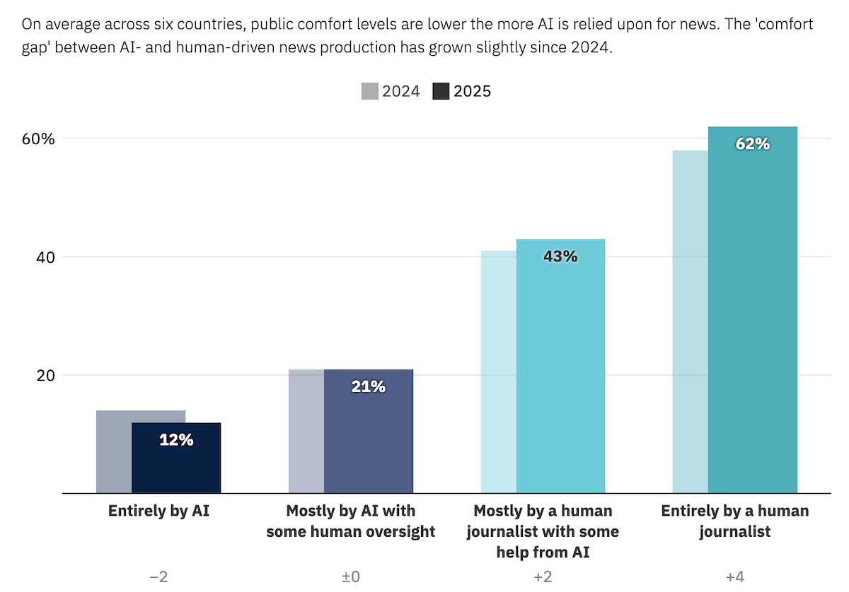 Enfin, le Reuters Institute note que, même si le public reconnaît le potentiel des IA dans la production d’information, une majorité estime qu’elles doivent rester des outils d’assistance plutôt que de création autonome. Les utilisateurs et utilisatrices se disent favorables à leur usage pour des tâches de soutien (résumés, traduction, aide à la recherche), mais beaucoup expriment des réserves à l’idée que des contenus journalistiques soient entièrement générés par IA sans supervision humaine.