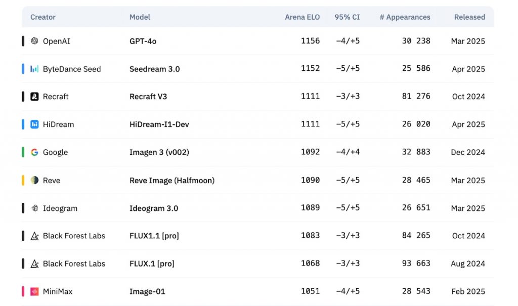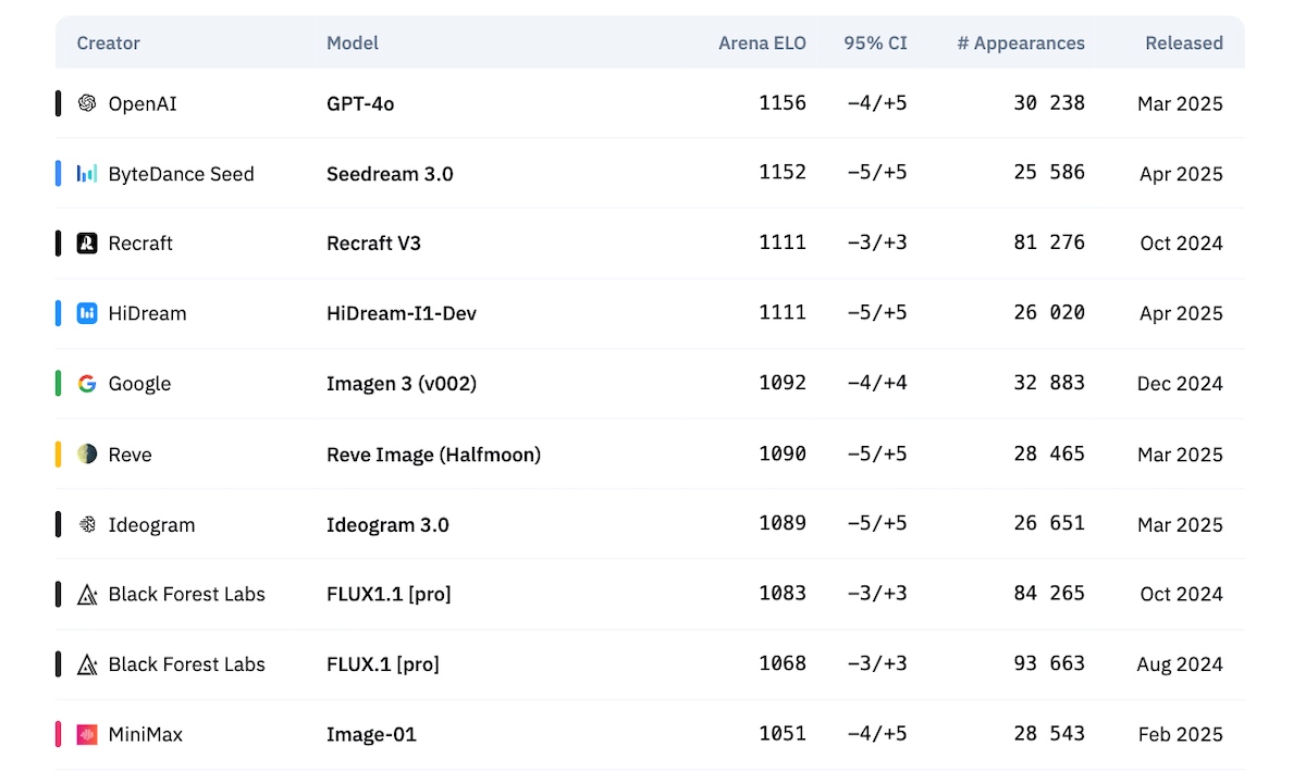 Voici les modèles les mieux notés en avril 2025, selon la Text to Image Arena :