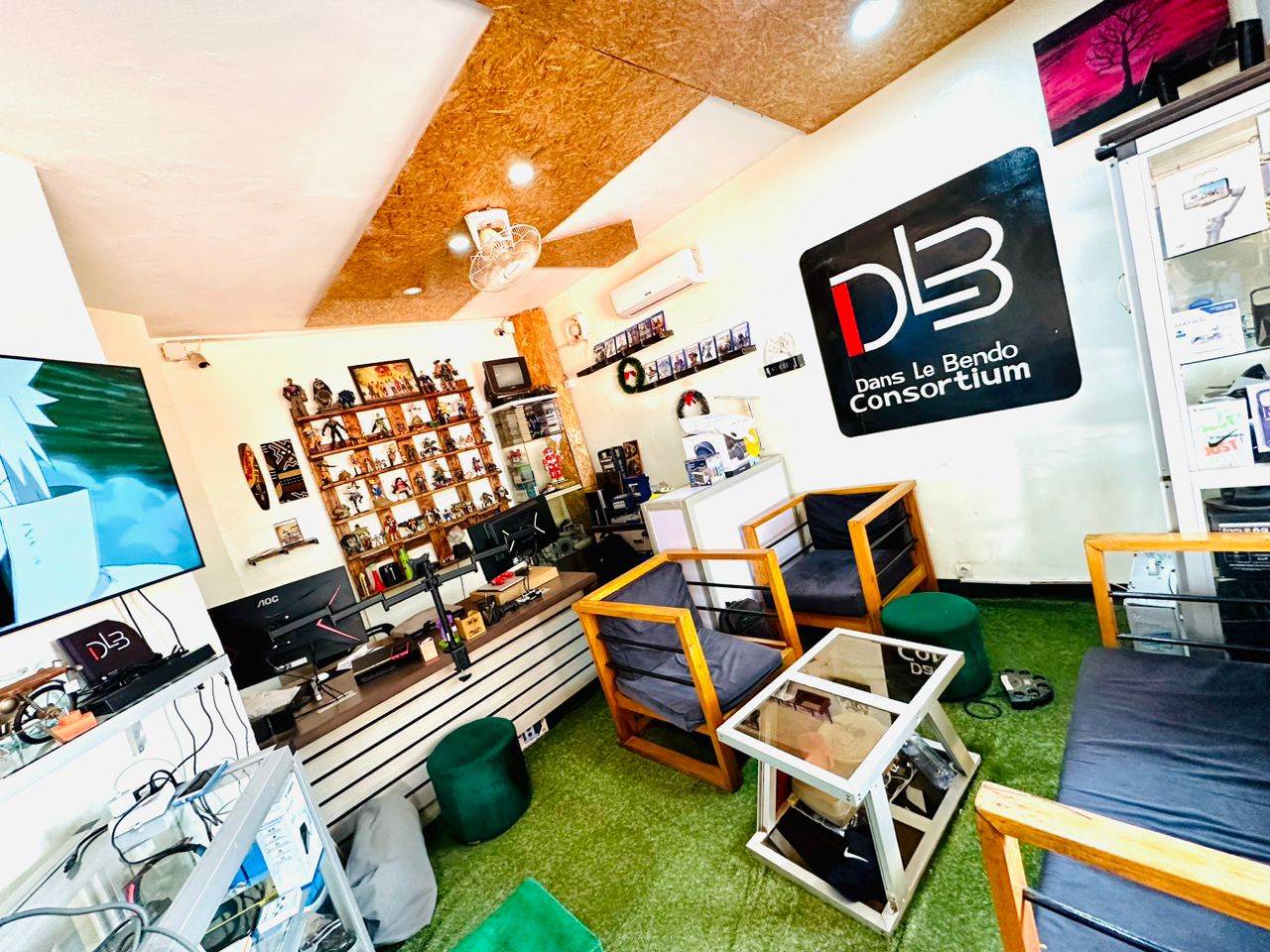 A la porte comme dans la plupart des boutiques, l’enseigne DLB-Consortium y est déclinée en graffiti. À l’intérieur nous observons sous un décor digne d’une série mangas, des étagères vitrées çà et là et soigneusement garnies pour le plaisir des clients. Ce décor particulier s’explique par le fait que DLB-Consortium preste dans la vente d’articles gaming et de figurines de vos séries mangas préférées. Pour Abdoul Moctar, la finalité c’est que cette boutique ne soit pas vue comme un simple commerce parmi tant d’autres sur le marché. « Dans Le Bendo Consortium, c‘est vraiment comme au bled, dans son élément (chez soi à la maison ndlr) » dixit le manager.