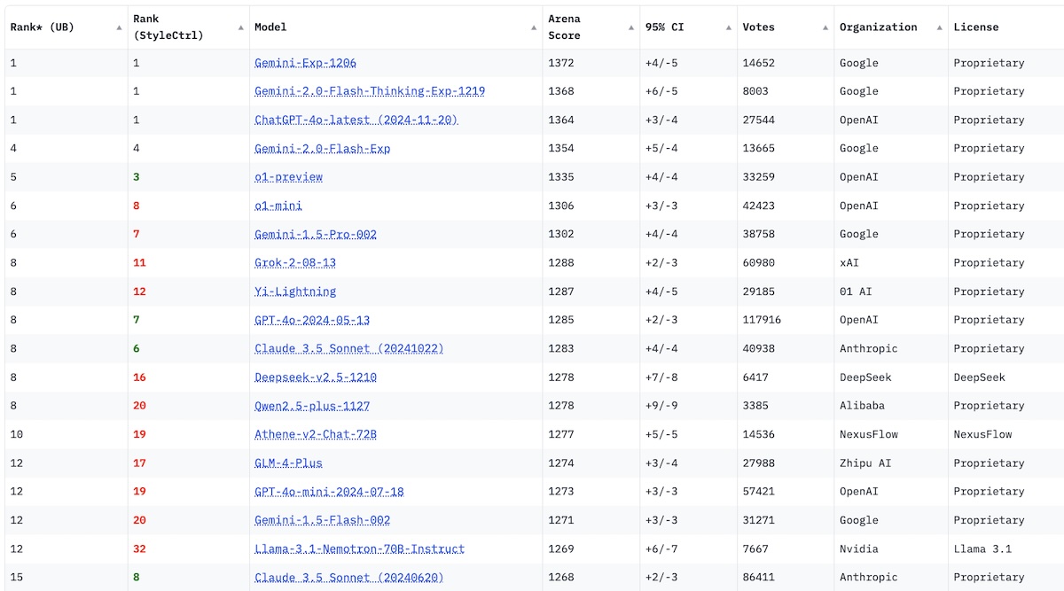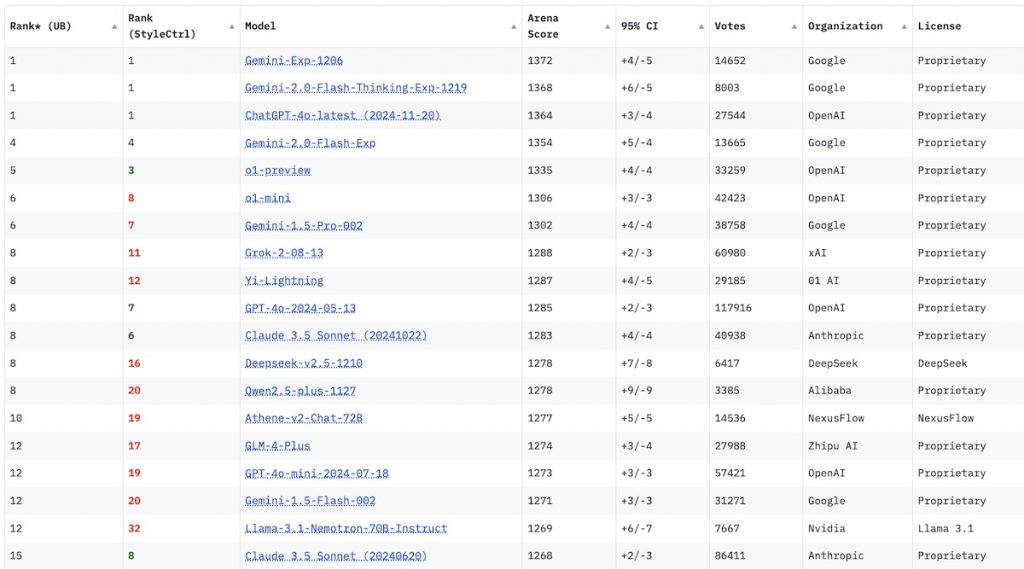 Google et OpenAI se disputent âprement les premières positions de la Chatbot Arena. Ce mois-ci, huit des dix modèles les plus performants ont été conçus par l’une de ces deux entreprises. Google prend néanmoins un léger ascendant, en s’adjugeant les deux premières positions du classement grâce à la sortie de Gemini 2.0 Flash et relègue OpenAI en troisième position.