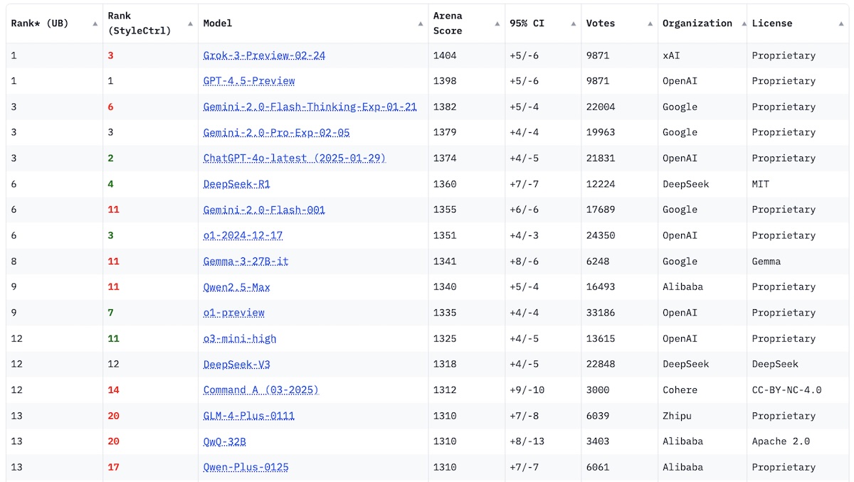 Voici les 10 modèles d’IA les plus performants en mars 2025, selon la Chatbot Arena :