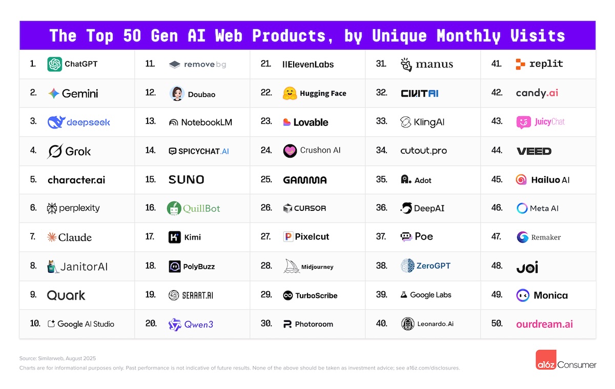 Andreessen Horowitz précise que les plateformes « intégrant des fonctionnalités d’IA générative significatives, mais non natives, comme Canva et Notion, ne sont pas incluses » dans le classement.