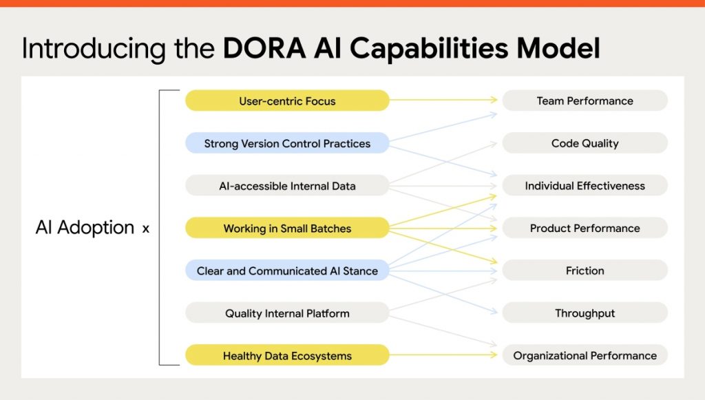 - Orientation utilisateur : le document précise qu’une équipe doit placer les besoins des développeurs et des clients au centre de ses choix. L’impact concret de l’IA sur l’expérience et sur la valeur créée est évalué systématiquement.